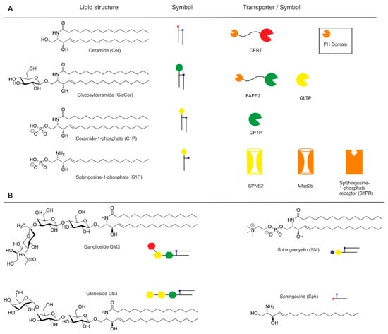 Last, but not least, for transport of sphingolipids between distinct membranes there are again two opposing mechanisms known. The first mechanism, vesicular transport, starts with the budding of parts of the donor membrane via vesicle fission and ends with vesicle fusion with the acceptor membrane. This process is highly regulated by proteins and is dependent on ATP. In this process, a number of different lipids is usually transferred at the same time. The nonvesicular transport of lipids is mediated by more or less mono-specific lipid transporters that lift a distinct lipid out of the donor membrane for binding it within a hydrophobic cavity. After transport to the acceptor membrane, the cargo is discharged and the transporter can accept another cargo molecule for transport. This mechanism applies to the so-called lipid transport proteins (LTP), some of which (that are specific for sphingolipids) will be reviewed in this article. Although the sphingolipid transport proteins are all soluble proteins, it seems that an efficient transport of lipids requires the existence of membrane contact sites (MCS), in which different membranes come very close to each other [,]. The sphingosine-1-phosphate (S1P) transporters, that are also reviewed, substantially differ from the LTPs. While the substrates of LTPs are definitively membrane-bound, this does not necessarily apply to S1P. This lipid differs from the more complex sphingolipids by its higher polarity and higher solubility in water. Although S1P will bind to membranes, it is also relatively soluble and its critical micelle concentration was found to be 12 µM [], which is well above its minimal bioactive concentration. It is therefore possible that proteins enabling the transport of this lipid through membranes are more like channels rather than being related to the LTP type of transporters in terms of mechanism. However, both types of transporters share the property that they crucially control the transport and thus the biological function of sphingolipid intermediates. In this review, the different known sphingolipid transport proteins are described with respect to their potential as targets for anticancer drugs. Figure 1 summarizes the structures of the preferred or exclusive sphingolipid substrates together with the names of the proteins that transport them. In addition, symbols are introduced for each lipid and transporter, which are referred to below.
