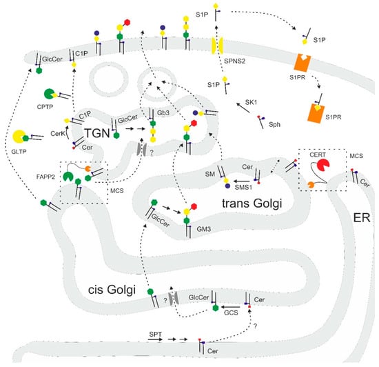 Lipids are essentially defined by their insolubility in water. In particular, membrane lipids, such as sphingolipids, can be transported in biological systems only within one membrane or between two different membranes. Since many processes controlled by sphingolipids are separated spatially, the transport of these molecules is of particular importance. The most obvious example is the spatial separation of processes of de novo sphingolipid biosynthesis. In contrast to degradation of sphingolipids, which is mostly catalyzed by soluble enzymes, all enzymes involved in the biosynthesis of sphingolipids are membrane-bound. Starting with serine-plamitoyl transferase (SPT), ceramide is synthesized in four steps within the cytosolic leaflet of the ER membrane. The synthetic steps downstream of ceramide, leading to formation of sphingomyelin, glucosylceramide, and more complex glycosphingolipids (GSL) take place at different localizations of the Golgi apparatus (GA). Therefore, there is much to suggest that the transport of intermediates between the different membranes is an essential component of sphingolipid biosynthesis. In addition, previous studies have shown that the function and activity of individual sphingolipid species is dependent on their specific subcellular or extracellular locations. This suggests a closer examination of the underlying transport processes.