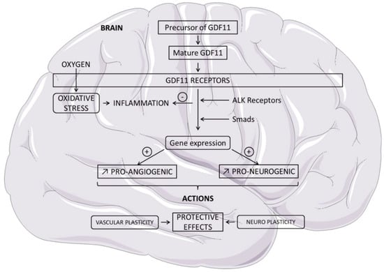 Studies have focused on GDF11 as a potential anti-aging regulating molecule. Evidence indicates that it may function as a pro-neurogenic and pro-angiogenic agent (Table 1). Consistent with these properties, GDF11 treatment may protect the brain, and its administration may be a viable approach for improving deleterious aspects of brain aging and neurodegenerative diseases. Recombinant GDF11 (rGDF11) treatment improves the cerebral vasculature and enhances neurogenesis [,]. In the context of aging, GDF11 appears to promote vascular and neural plasticity of the central nervous system [,,]. It is suggested that cognitive improvements elicited by young blood administrated to animals may not be limited to neurogenesis but may also be due to enhancements in synaptic plasticity []. Biochemical experiments have demonstrated that GDF11 can activate Smad2, suggesting the involvement of ALK receptors in GDF11 signaling [] (Figure 1). Investigation of GDF11 in the cerebrospinal fluid (CSF) has been studied. In patients with amyotrophic lateral sclerosis (ALS), higher CSF levels of GDF11 were correlated with a better disease issue []. In this complex field, GDF11 biology suggests that it is a major regulator of brain functions in connection with other growth and trophic factors. Neuronal temporal identity is multifactorial. Spatial and temporal growth factors influence each specialized cell type. Brain anatomy includes multiple specialized cells that function together through the neurovascular unit. This unit appears fundamental for brain metabolism and is regulated by numerous endogenous modulators. In this field, inhibition of inflammation appears to be a potential therapeutic strategy for neuro-inflammatory injury, and the role of GDF11 may be evoked [].