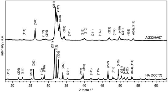 X-ray diffractograms of HA and AG33HA67 composite are shown in Figure 1. Reflexes of HA corresponded well to a (carbonated) HA phase (JCPDS PDF No. 09-432) and were indexed according to the literature []. The lyophilized scaffold showed much broader reflexes as it lacked thermal treatment; however, indexing of the major signals revealed also an HA phase.