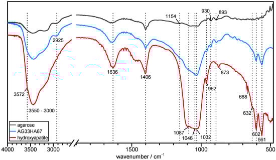 FT-IR spectra of agarose (black), hydroxyapatite (red), and agarose/hydroxyapatite composite (AG33HA67; blue).