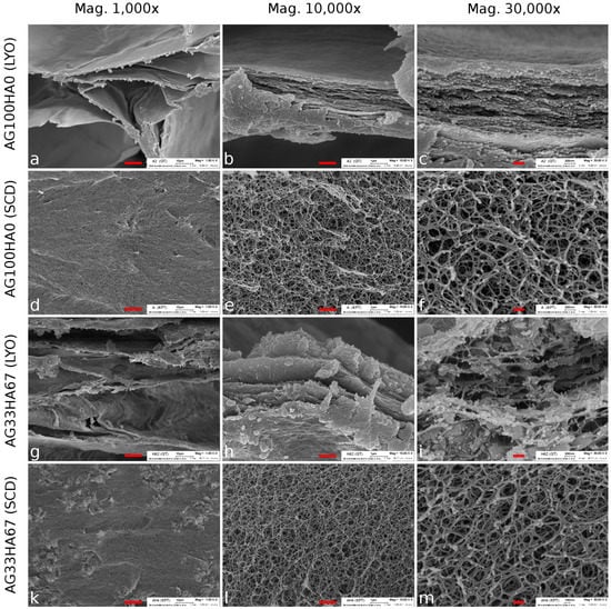 SEM images of agarose lyophilized (LYO; (a–c)) and supercritically-dried (SCD; (d–f)) and AG33HA67 composite LYO (g–i) and SCD (k–m) at three different magnifications. The scale bar is 10 (left), 1 (middle), and (right), respectively.