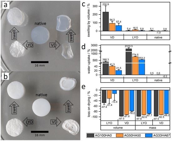 Shrinking and swelling of the scaffold are important characteristics, as they influence the mechanical properties, drug release, and handling after preparation []. Shrinking behavior was tested with drying at 40 under vacuum (VD) or lyophilization (LYO). Upon vacuum drying, the original geometry collapsed completely regardless of the composition (Figure 4a,b); only 2.5–21% of the original volume remained (Figure 4e). Lyophilization, however, resulted in increased form stability (Figure 4a,b), with 52% (AG100HA0), 69% (AG50HA50), and 85% (AG33HA67) of the respective original volume remaining (Figure 4e). Both drying methods removed most of the water from the hydrogels, which was indicated by the mass loss (Figure 4e). AG100HA0, a hydrogel with 2%wt polymer, lost about 98% of its mass, AG50HA50 (2%wt AG, 2%wt HA, and ca. 3%wt NaNO3 in the unwashed hydrogel) about 93% of its mass, and AG33HA67 (2%wt AG, 4%wt HA, and ca. 6%wt NaNO3 in the unwashed hydrogel about 88 of its mass.
