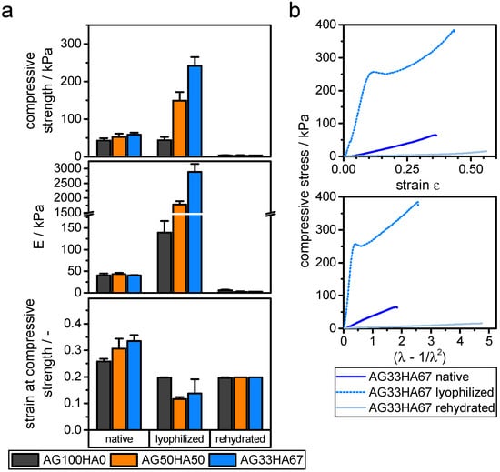 Compressive properties of native hydrogels, lyophilized, and rehydrated gels. (a) Compressive strength, elastic modulus E, and strain at compressive strength, derived from uni-axial unconfined compression (). (b) Typical stress-strain and stress () curves for AG33HA67 gels.