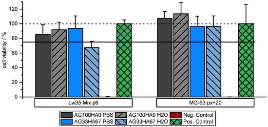 Cell viability of hMSCs Lw35and MG-63 cell lines on pure agarose (AG100HA0) and AG33HA67 composites. Scaffolds washed with PBS prior to MTT assay display higher cell viability. One hundred percent viability (dotted line) and 75% viability (solid line) are marked for clarification.