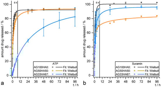 The release profiles for ATP and suramin are depicted in Figure 7a,b, respectively. They all showed a burst release, where a major amount of the incorporated drug was released within the first 8 , which is a typical behavior for hydrogel systems and the release of hydrophilic drugs into aqueous media in general. For ATP, a higher amount of HA resulted in a slower release, visible in the decreased slope. Suramin release seemed to be less dependent on the material, and remarkably, the AG50HA50 scaffolds showed the lowest overall amount released after 96 . Table 2 summarizes the relevant parameters for the different fitting functions of both ATP and suramin release profiles. They can all be fitted with a Weibull release function with accurately describing the amount of drug M at time t. In the case of ATP, all systems released up to about 92% of the drug, and the latency time T was zero (within the accuracy). However, this function was not based on kinetic considerations and thus only useful for direct comparison of the different profiles for which the parameter q was used. A high value of q represents a slower release. It increased with increasing amount of HA in the material from 0.83 to 34 , indicating a slower release of the drug. This can also be derived from the decreasing value of release rate k in the first-order model, while , however, represents the release profiles especially up to about 85% release, but usually underestimates the maximum amount released, as it di for all three samples. In the Korsmeyer–Peppas model, the exponent n is related to the release mechanism. For cylindrical systems, the Fickian model (Case I) would be at , when the release is solely governed by diffusion. With , there is anomalous transport behavior, where diffusion and system relaxation processes occur. After that, Case II () and Super Case II () models apply. The Korsmeyer–Peppas model reveals a diffusion-based mechanism for AG100HA0, while the exponents of the other samples indicate a more complex release mechanism. The low nof 0.24 for AG50HA50 may be due to physico-chemical interactions between drug and scaffold, while the n of 0.64 for AG33HA67 suggests an anomalous transport, sustaining the release.