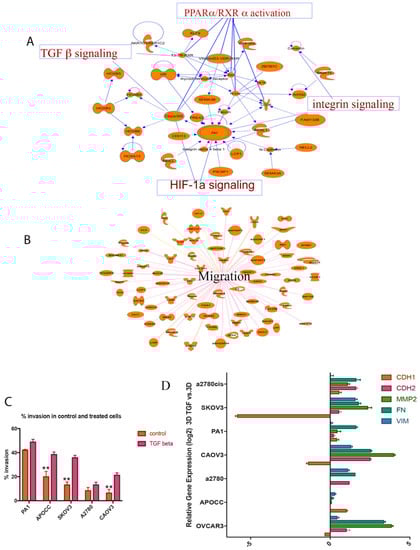 (A,B) Ingenuity® Pathway Analysis (IPA®) (QIAGEN Bioinformatics) of genes differentially expressed in 3D SKOV3 model vs. 2D and their associated pathways; (C) TGF-β can increase the invasion potential of the cells in a significant way. APOCC, SKOV3 and CAOV3 show a significant increase in invasion; (D) epithelial to mesenchymal signature gene expression pattern in 3D models treated with TGF-β compared to control 3D models. Real-time gene expression analysis shows that 3D models treated with TGF-β can activate a partial EMT in most of the ovarian cancer cell lines studied. The data in C is means with error bars representing Standard Error of Mean (SEM) from three experiments; ** p < 0.01 (Student’s t-test).