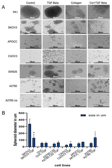 The size of the TGF-β-treated and control spheroids was also analyzed. The average size of the spheroids of the ovarian cancer cell lines is as following: PA-1 [433 um], SKOV3 [339 um], OVCAR3 [55 um], SW626 [149um], APOCC [50 um], A2780 [53 um], A2780 CIS [44 um], CAOV3 [26 um] (Figure 2B). Most of the cell lines displayed an increased spheroid size in the presence of TGF-β, while SKOV3 cell line showed a smaller but more compact spheroid after treatment with TGF-β. The increase in the spheroid size, with distinct zones of active growth area and necrotic center can induce more growth potential, cell viability and migration []. CAOV3 and A2780 cell lines have the least spheroidogenesis capacity among the cell lines that have been studied, but they were able to form spheroids of large size and better compactness after the TGF-β treatment. The compactness of spheroids was measured by checking their resistance to mechanical dissociation. Spheroids treated with TGF beta showed better resistance towards mechanical dissociation by gentle pipetting. The invasive capacity of the spheroids was evaluated by embedding the spheroids/aggregates in 3D collagen I matrices. The spheroids with more invasive ability showed better spreading and sprouting as shown in PA-1 and SKOV3 cell lines treated with TGF-β and embedded in the collagen matrix (Figure 2A). In conclusion, TGF-β treatment can increase the size and compactness of spheroids in most of the ovarian cancer cell lines studied.
