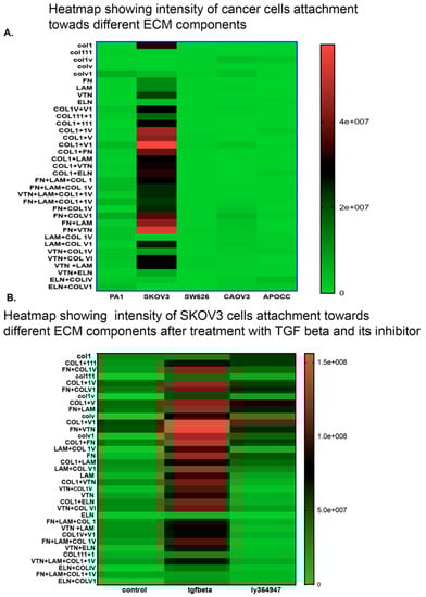 Pattern of cell adhesion on the different molecules depends on the cell type. SKOV3 shows better adhesion (A) and presence of TGF-β increases the cell adhesion on some ECM components more strongly in SKOV3 cells in comparison to control and TGF-β specific inhibitor LY364947 (B).