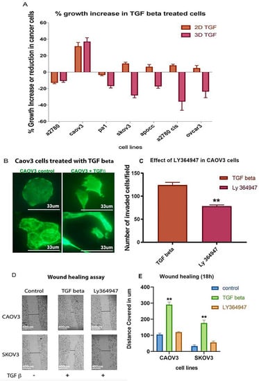 (A) MTS assay shows the % increase or reduction in growth potential after TGF-β treatment. Only CAOV3 cell lines show better growth progress compared to other cell lines in the presence of TGF-β. (B) The Epithelial to Mesenchymal Transition of CAOV3 cells after treatment with TGF-β. The image was taken by using a Zeiss inverted microscope using Actin staining. Scale bar = 33 um. (C) The effect of TGF-β specific inhibitor LY 364947 in cancer cell invasion. Boyden chamber assay shows reduction in the invasion potential of CAOV3 cells treated with TGF-β specific inhibitor. (D) A pictorial representation of the in vitro wound healing assay in CAOV3 and SKOV3 cells treated with TGF-β specific inhibitor (Ly 364947) and its control. (E) Graphical representation of wound healing assay in SKOV3 and CAOV3 cells. The data in (C,E) is means with error bars representing Standard Error of Mean (SEM) from three experiments; ** p < 0.01, * p < 0.05 (Student’s t-test).