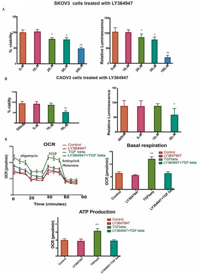 (A,B) left panel Shows % viability of SKOV3 and CAOV3 cells treated with different concentration of LY364947. The right panel shows the relative luminescence of ATP production in SKOV3 cells and CAOV3 cells treated with LY364947. (C) Represents seahorse assays showing oxygen consumption ratio in the top left panel, basal respiration in the top right panel, ATP production in the bottom panel for the SKOV3 cells treated with TGF-β specific inhibitor, TGF-β or in combination. The data in (A,B,C) is means with error bars representing standard error of mean (SEM) from three experiments ** p < 0.01, * p < 0.05 (Student’s t-test).
