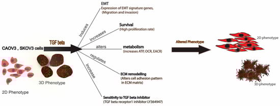 In conclusion, we demonstrated that both 2D and 3D phenotypes are efficient models in cancer invasion and migration studies. TGF-β—a well-known cytokine for its protumorigenic properties in cancer—can induce partial EMT in SKOV3 and CAOV3 cells both in 2D and 3D models. Our results suggest that TGF-β can induce partial EMT, cell survival, increased metabolism, ECM remodeling and sensitivity to LY364947 (Figure 6). Furthermore, our results highlight the importance of TGF-β in tumor invasion in SKOV3 and CAOV3 cells and it can be proposed as a model system to study cancer cell migration and invasion.