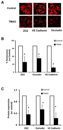 The junctional architecture in endothelial cells is mainly comprised of adherent junctions and tight junctions, which are intermingled and maintain the integrity of the endothelium [27]. These junctions function as a barrier in regulating paracellular permeability and maintaining cell polarity. ZO-2, Occludin, and VE-cadherin are essential junction proteins, which are associated with junctional integrity. Downregulation of these proteins leads to junctional disruption and enhanced cellular permeability. Hence, we investigated whether TMAO-induced HMGB1 activation could lead to disassembly of junction proteins. Our immunofluorescence analysis showed that TMAO markedly decreased the expression of tight junction proteins ZO-2, Occludin, and VE-cadherin, and adhered on endothelial cell monolayers (Figure 1A,B). ZO-2, Occludin, and VE-Cadherin downregulation by TMAO was further confirmed by Western blotting (Figure 1C), suggesting that that TMAO decreased the expression of tight junction proteins.