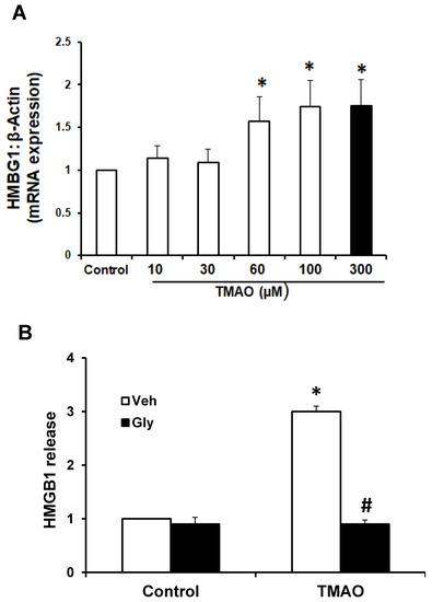 Effect of TMAO on the expression of HMGB1 in EOMAs. (A) RT-PCR analysis of high-mobility group box 1 (HMGB1) expression in EOMAs treated with different concentration of TMAO (n = 6). (B) Summarized ELISA data showing the HMGB1 extracellular release with or without stimulation of TMAO and/or glycyrrhizin (120 µm). Veh: vehicle, Gly: glycyrrhizin. * Significant difference from control, # significant difference from TMAO.