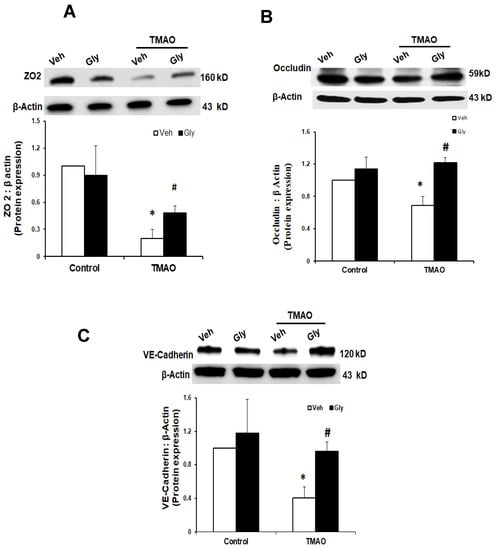 Effects of HMGB1 binder glycyrrhizin on TMAO-induced tight junction proteins ZO-2, Occludin, and VE-Cadherin in EOMAs. Representative Western blot (n = 3–5) images show the ZO-2 (A), Occludin (B), and VE-Cadherin (C) expression in EOMAs with or without stimulation of TMAO and/or HMGB1 inhibition by glycyrrhizin. Veh: vehicle. * significant difference from control, # significant difference from TMAO.