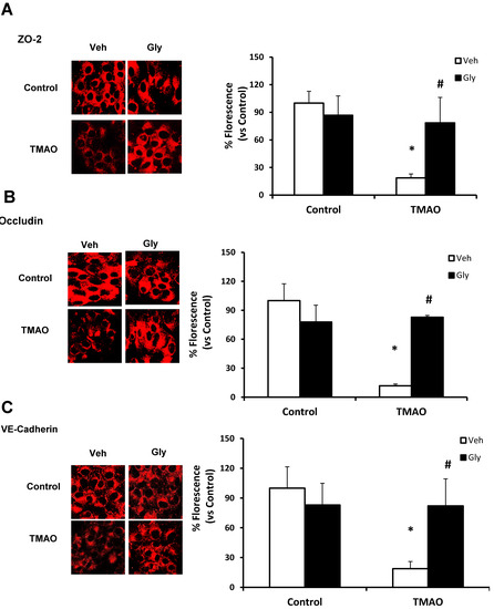 Effects of HMGB1 binder glycyrrhizin on TMAO-induced tight junction proteins ZO-2, Occludin, and VE-Cadherin in EOMAs. Representative confocal images (n = 3–5) show the ZO-2 (A), Occludin (B), and VE-Cadherin (C) expression in EOMAs with or without stimulation of TMAO and/or HMGB1 inhibition by glycyrrhizin. Veh: vehicle. * significant difference from control, # significant difference from TMAO.