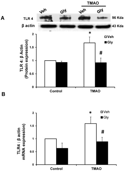 The mouse endothelial cell line also known as EOMA cells was purchased from ATCC (Manassas, VA, USA), which was isolated originally from mouse hemangioendothelioma. These EOMAs were cultured in Dulbecco’s modified Eagle’s medium (Gibco, Carlsbad, CA, USA) with 1% penicillin–streptomycin (Thermo Fischer Scientific, Carlsbad, CA, USA) and supplemented with 10% fetal bovine serum (Thermo Fischer Scientific), and were placed in a humidifier at 37 °C and supplied with 95% air and 5% CO2 mixture. Cells were trypsinized with Trypsin (Trypsin/EDTA; Sigma, St. Louis, MO, USA). The EOMAs were further diluted in Dulbecco’s modified Eagle’s medium supplemented with 10% fetal bovine serum. Cells were treated with TMAO (10, 30, 100, and 300 μm) for the TMAO stimulation, and then incubated overnight [9]. In glycyrrhizin (gly) cell groups, cells were pretreated with gly (120 µM) for thirty minutes.