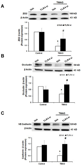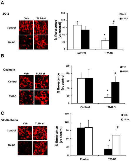 Effects of TLR4 inhibition by TLR4 siRNA on TMAO-induced tight junction proteins ZO-2, Occludin, and VE-Cadherin in EOMAs. Representative confocal analysis shows the ZO-2 (A), Occludin (B), and VE-Cadherin (C) expression in EOMAs with or without stimulation of TMAO and/or HMGB1 inhibition by glycyrrhizin. n = 5. Veh: vehicle. * significant difference from control, # significant difference from TMAO.