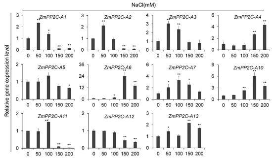 We next investigated the expression patterns of ZmPP2C-A genes under sodium chloride (NaCl) treatment. Interestedly, we observed that the expression patterns of ZmPP2C-A genes varied significantly in response to salt treatments. As shown in Figure 2, ZmPP2C-A1, ZmPP2C-A2, and ZmPP2C-A11 were induced by NaCl at lower concentrations (≤100 mM), while inhibited by NaCl at higher concentrations (≥150 mM). ZmPP2C-A3 was only induced by NaCl at lower concentrations; nevertheless ZmPP2C-A5 was suppressed by NaCl at the highest concentration. ZmPP2C-A7 was induced by NaCl from 50 mM to 150 mM, with a peak occurring at 100 mM; ZmPP2C-A4, ZmPP2C-A6, and ZmPP2C-A10 were more strongly induced by NaCl at higher concentrations; ZmPP2C-A12 and ZmPP2C-A13 showed opposite expression patterns in response to NaCl stresses, namely ZmPP2C-A12 was inhibited while ZmPP2C-A13 was induced by NaCl at higher concentrations. In addition, more than twenty-fold changes were observed in ZmPP2C-A6 under treatment with 150 mM NaCl, which was outstanding among ZmPP2C-A genes (Figure 2). These expression patterns suggested different roles of ZmPP2C-A genes in regulation of maize salt stress responses.