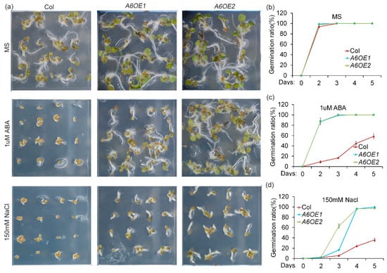 To determine the biological roles of ZmPP2C-A genes in abiotic stress responses, we overexpressed ZmPP2C-As in Arabidopsis, and multiple stresses experiments were conducted on the transgenic plants. In Arabidopsis and other plants, ABA has been widely known as a negative regulator of seed germination [,]. Salt is a natural stress that inhibits seed germination []. To know how ZmPP2C-As regulate ABA response, seeds of Col and ZmPP2C-A6 overexpression lines were sown on a Murashige and Skoog (MS) medium, supplemented with or without 1 μM ABA. After 48 h of cultivation, germination rates of both Col and ZmPP2C-A6 transgenic seeds were almost 100% on MS plates without ABA (Figure 3a,b). Although germination rates of both materials were decreased in MS plates with 1 μM ABA, germination rates of Col seeds were reduced more as compared to those of ZmPP2C-A6 overexpression lines (Figure 3a,c). These data suggested that ZmPP2C-A6 is a positive regulator of ABA responses. On MS plates supplied with 150 mM sodium chloride, ZmPP2C-A6 overexpression lines germinated faster than Col, although there were no different germination rates between Col and ZmPP2C-A6 overexpression transgenic seeds on MS plates without salt (Figure 3a,d), suggesting a positive role of ZmPP2C-A6 in plant salt tolerance. The similar germination tendencies were also observed for transgenic Arabidopsis plants overexpressing ZmPP2C-A1 (Figure S1) or ZmPP2C-A2 (Figure S2) under ABA and salt stresses. Taken together, these data implied that ZmPP2C-A1, ZmPP2C-A2, as well as ZmPP2C-A6, played positive roles in ABA and salt stress responses.