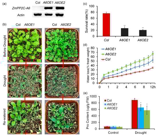 Previously we reported that ZmPP2C-A10 attenuated plant drought tolerance []. In order to know the roles of other ZmPP2C-A genes in regulation of plant drought tolerance, we treated the ZmPP2C-A transgenic Arabidopsis plants with drought stresses. Twenty-day-old seedlings of Col and ZmPP2C-A6 overexpression lines were stressed with severe drought stress. After being re-watered, survival rates were counted. We observed that more than 70% seedlings of Col survived, while only ~20% seedlings of ZmPP2C-A6 transgenic lines survived (Figure 4a–c), implying that ZmPP2C-A6 negatively regulates drought resistance. Water loss of excised leaves from Col and ZmPP2C-A6 transgenic lines were measured every 30 min. The results showed that ZmPP2C-A6 transgenic lines lost water faster than Col (Figure 4d). In addition, the proline contents of the two materials were detected with or without drought stresses. Under well-watered conditions (without drought stress), no obvious difference was observed between the two materials (Figure 4e). But under severe drought stress, the levels of osmolyte proline in Col was significantly higher than those in ZmPP2C-A6 overexpression lines (Figure 4e). Therefore, compared to Col, ZmPP2C-A6 overexpression lines were more sensitive to drought stress, which resulted from faster water loss and less accumulation of osmolyte proline. We conducted similar drought stress and water loss assay to ZmPP2C-A2 transgenic lines, and similar phenotypes were observed to these transgenic lines in response to drought stresses (Figure S3). All these data suggested that both ZmPP2C-A2 and ZmPP2C-A6 played negative roles in plant drought stress responses.