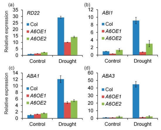 Four marker genes were chosen for expression analysis in ZmPP2C-A6 transgenic plants, namely RD22, ABI1, ABA1, and ABA3. As a member of the BNM2, USP, RD22 and polygalacturonase isozyme (BURP) protein family, RD22 was reported to be induced by drought, salt stress, and endogenous ABA [], and has been used as a marker gene for abiotic stress [,,]. ABI1 is the key component in ABA signaling pathway in Arabidopsis [,,], while ABA1 and ABA3 both participate in ABA biosynthesis []. All four marker genes were down-regulated in ZmPP2C-A6 transgenic plants compared with Col plants after drought treatment, implying that both ABA biosynthesis and signaling were inhibited in ZmPP2C-A6 transgenic plants. Overexpression of ZmPP2C-A6 may lead to the negative feedback regulation of ABA accumulation and signal transduction in Arabidopsis. Considering the ABA function in promoting drought stress tolerance, the expression levels of marker genes were consistent with the phenotypes that ZmPP2C-A6 transgenic plants were sensitive to drought stress.