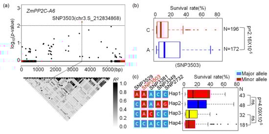 Previously, an association mapping panel containing 527 maize inbred lines with various genetic backgrounds were collected [], and 368 inbred lines of which were re-sequenced through RNA-sequencing []. In addition, 1.25 M high quality single nuclear polymorphisms (SNPs) were called out from this association panel by integrating reduced genome sequencing (GBS), high-density array technologies (600 K), and RNA-sequencing []. Survival rates of this association panel after salt and drought stresses were reported by us and other researchers recently [,]. In order to mine the natural variations of ZmPP2C-A1, 2, 6 associated with drought and salt tolerance, SNPs located within ZmPP2C-A genes were collected, and association analyses were performed using these SNPs and the survival rates of 368 maize inbred lines stressed with drought or salt, respectively. Three algorithms, namely general linear model (GLM), GLM + Q, and mixed linear model (MLM), were used in these analyses. We found that there were no SNP located in these ZmPP2C-A genes that were detected with all three algorithms associated with survival rates after salt stress (Table S1). Meanwhile, there were different amounts of SNPs within ZmPP2C-A6 that were identified to be associated with survival rates after drought stresses with all three statistical models (Table S2). The lead SNP (SNP3503) was located in the intron of ZmPP2C-A6, which has the A and C alleles (Figure 6a). According to this lead SNP, the 368 inbred lines could be divided into two groups, the A and C groups, and the survival rates between these two groups were significantly different in that plants with allele A had much higher survival rates than those with C alleles (Figure 6b). Based on the lead SNP, we analyzed the haplotypes (Hap) of ZmPP2C-A6 in the association panel. A total of four Haps were detected, and Hap1 and Hap2 have obviously higher survival rates than those of Hap3 or Hap4 (Figure 6c).