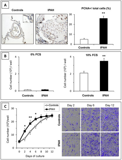 Proliferation of pulmonary vascular cells in idiopathic pulmonary artery hypertension (IPAH). (A) In situ cell proliferation in pulmonary arteries from control and IPAH samples was estimated by immunohistochemistry for proliferating cell nuclear antigen (PCNA). Positive cells were more numerous in pulmonary arteries from patients with IPAH than those from controls. (B) In vitro proliferation of pulmonary artery smooth muscle cells (PASMCs) cultured without or with 10% FCS for 48 h. (C) Cellular growth curves. IPAH-PASMCs grew faster during the exponential phase of growth, but reached a similar density at confluence compared to controls (n = 6 in each group). * p < 0.05; ** p < 0.01.