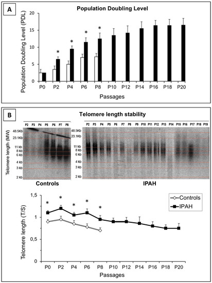 Growth capacity of PASMCs. (A) Population doubling level (PDL) was calculated at each passage by cell counting. In contrast to control cells, IPAH-PASMCs continued proliferating for many more passages. * p < 0.01. (B) Changes in telomere length in control and IPAH-PASMCs with advancing population doubling in vitro, as illustrated by Southern blotting (representative image) and qPCR (bottom panel). * p < 0.01 between controls and IPAH.