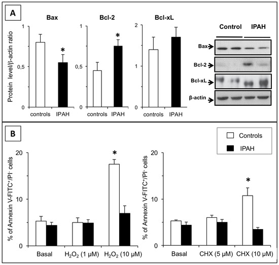 Apoptosis resistance in IPAH. (A) Expression levels of pro- and anti-apoptotic proteins Bax, Bcl-2, and Bcl-xL in PASMCs from controls and from patients with IPAH (n = 6 in each group). (B) The effect of H2O2 (1–10 µM) or cycloheximide (5–10 µM) on apoptosis, as determined by annexin V staining. As shown, the two treatments induced apoptosis in control (C)-PASMCs, while IPAH-PASMCs remained unresponsive. * p < 0.01 between controls and IPAH.