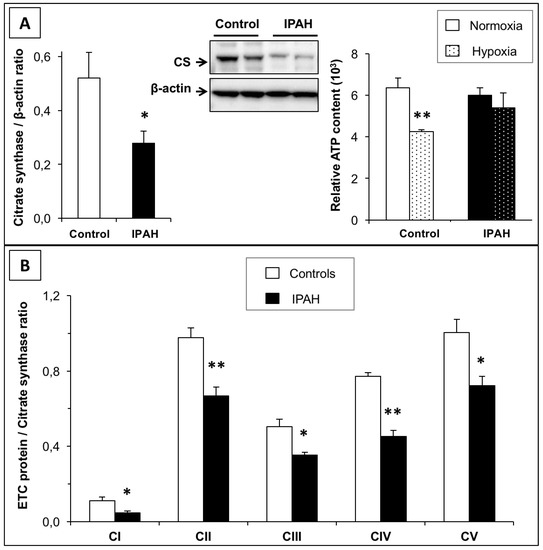 Energetic metabolism shift from mitochondrial respiration to glycolysis in IPAH. (A) Citrate synthase protein expression was lower in IPAH-PASMCs than in C-PASMCs. Measurement of ATP content in C-PASMCs and IPAH-PASMCs maintained for 24 h in normoxia (21% O2) or hypoxia (2% O2) (n = 5 in each group). (B): The levels of mitochondrial electron transport chain components were measured. The levels of different proteins were normalized against citrate synthase. * p < 0.05 and ** p < 0.01 between controls and IPAH.