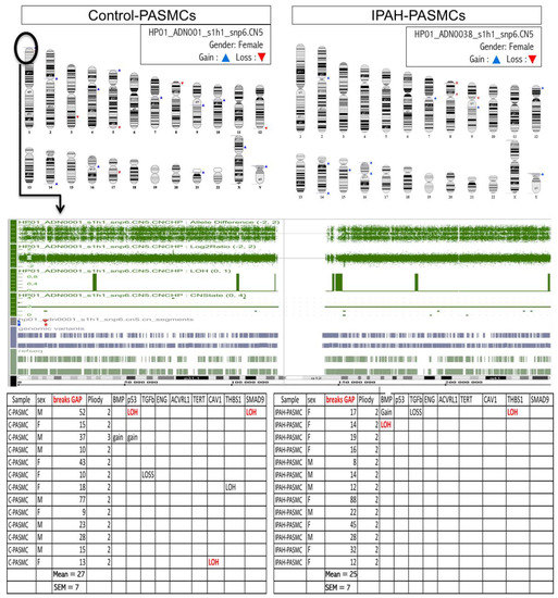 Genomic stability in IPAH. (Upper panel) Representative comparative genomic hybridization (CGH) array showing the gain, loss, and location of DNA regions on each chromosome. (Lower panel) The number of break-points in ten controls (C-PASMCs) and ten patients with IPAH (IPAH-PASMCs) as well as the gain, loss, and loss of heterozygosity (LOH) in all genomic DNA regions; this was done by focusing on regions encoding genes identified to be involved in the development of IPAH.