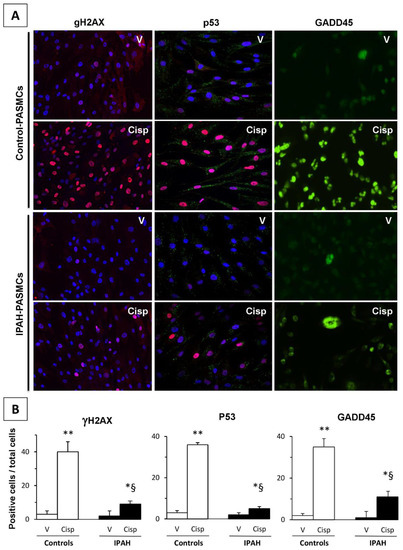 DNA damage and repair in IPAH. (A) Representative fluorescence microscopy images of phosphorylated γH2AX, p53, and GADD45—factors required for cell cycle arrest. Stimulation with cisplatin caused a sharp increase in γH2AX phosphorylation, which was higher in controls than in IPAH samples. Phospho-p53 and - growth arrest and DNA damage-inducible (GADD)45 staining patterns also showed similar profiles. (B) The ratio of positive cells/total cells in each condition was quantified in PASMCs (n = 6 in each group). 100× magnification. * p < 0.05, ** p < 0.01 between vehicle and cisplatin. § p < 0.01 between control- and IPAH-PASMCs under the same conditions.