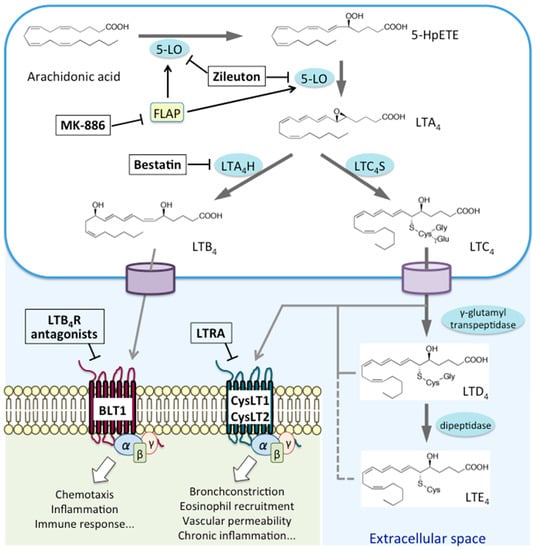 LTs are classified into two groups: the chemoattractant LTB4, which only carries hydroxyl moieties, and CysLTs (LTC4, LTD4, and LTE4), which also carry amino acid moieties [7]. AA is first oxidized by 5-LO at the C-5 position to yield 5-hydroperoxyeicosatetraenoic acid (5-HpETE). It is then converted to an unstable intermediate, leukotriene A4 (LTA4); LTA4 is either converted to LTB4 by LTA4 hydrolase (LTA4H) or conjugated to reduced glutathione by leukotriene C4 synthase (LTC4S), yielding LTC4 [2]. LTC4 is then exported from the cell through transporters, such as multidrug-resistant protein 1, which recognize glutathione-containing molecules, and then converted to LTD4 and LTE4 by extracellular peptidases [7]. Signaling via BLT1 triggers chemotaxis, inflammation, and immune responses, whereas that through CysLTs results in bronchoconstriction, eosinophil recruitment, exacerbated vascular permeability, and chronic inflammation (Figure 1).
