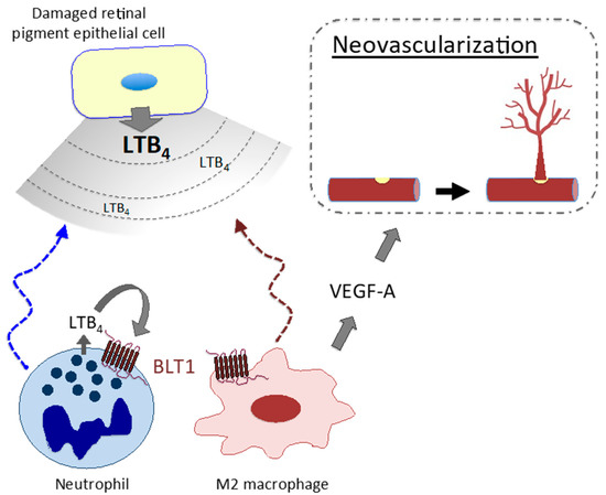 LT signaling is involved in the pathogenesis/pathophysiology of various diseases other than allergic diseases. Studies demonstrate involvement of LTB4–BLT1 signaling in the pathogenesis/pathophysiology of endotoxin shock [177], rheumatoid arthritis [178], inflammatory colitis [13,179], alveolar bone loss [180], osteoporosis [181], epidermolysis bullosa acquisita [182], contact dermatitis [183,184], psoriasis [185], and silica-induced lung cancer [8,186]. In addition, our recent study revealed that M2 macrophages expressing BLT1 augment neovascularization in a mouse model of AMD, indicating involvement of LTB4–BLT1 signaling in disease pathogenesis and strongly suggesting a potential novel therapeutic target for neovascularization [187]. Damaged retinal pigment epithelial cells release LTB4, which recruits immune cells such as neutrophils and inflammatory monocytes/macrophages to the injured retina. An autocrine/paracrine loop of LTB4 production in these cells leads to formation of an inflammatory environment. Among these cells, M2 macrophages secrete VEGF-A, which accelerates choroidal neovascularization (Figure 2).