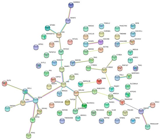 Gene interaction network of genes downregulated due to copy number loss in their regulatory enhancer region. Nodes represent proteins and edges represent protein–protein associations.