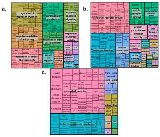 Tree map gene ontology analysis of enhancer CNV associated genes: (a) biological process; (b) molecular function; and, (c) cellular component.