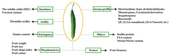 Fruit quality is affected by grafting in many aspects, including the morphometric and textural characteristics, sweetness and acidity, and aroma profile (Figure 1) []. The latter two parts could be considered together as flavor, a feature that has been attracting increasingly stronger research and consumer attention. Historically, the evaluation of vegetable flavor started with the identification of its constituents, including the contents of acids, sugars, volatiles, and other compounds, which individually elicit sensory responses []. The soluble solids content (SSC) and fructose were found to be significantly reduced in cucumber fruits collected from many growers in cucumber growing areas from plants using different rootstocks []. The SSC and titratable acidity (TA) were higher in both the grafted and self-grafted cucumber in the presence of 60 mM of NaCl []. The appropriated value of the TSS/TA ratio represents a central parameter, as it describes a good balance between sweetness and acidity in fruits []. However, the aroma and taste of the fruits depend not only on the scion, but also on the rootstock, and changes in the fruit quality after grafting depend on the different rootstocks used []. However, the molecular mechanisms by which grafting alters sweetness and acidity have remained largely unknown.