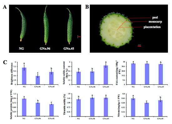 The phenotype and physiological quality of the cucumber fruit in the non-grafted plants, plants grafted onto the rootstocks of No.45 and No.96. (A) Phenotype of fruit in non-grafter plants (NG), GNo.96, and GNo.45. (B) Peel, mesocarp, and placentation of cucumber fruit. (C) Wax power, soluble solids content (SSC), free amino acid (FAA) content, soluble protein content, nitrate content, and titratable acidity in cucumber fruit.