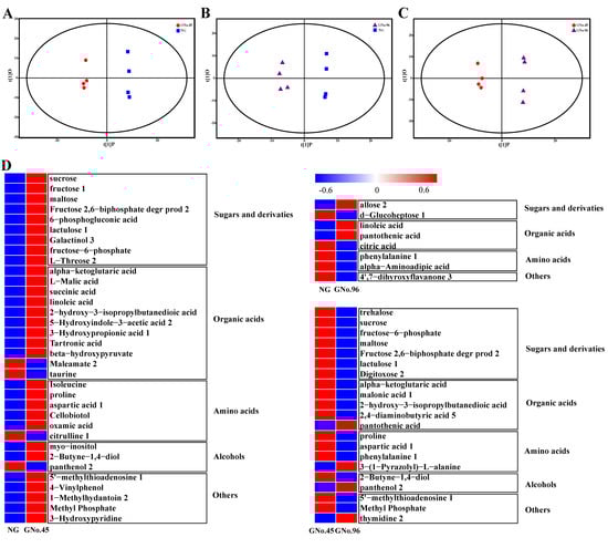 (A) OPLS-DA score plots generated from OPLS-DA models and different metabolites (DMs) in the cucumber fruit of NG, GNo.96, and GNo.45. (B) OPLS score plots (R2Y = 0.98; Q2 = 0.35). OPLS score plots (R2Y = 0.98; Q2 = 0.12). (C) OPLS score plots (R2Y = 0.98; Q2 = 0.27). (D) Heat maps of the contents of DMs in sugars and derivatives, organic acids, amino acids, alcohols, and others in fruits of NG, GNo.96, and GNo.45.