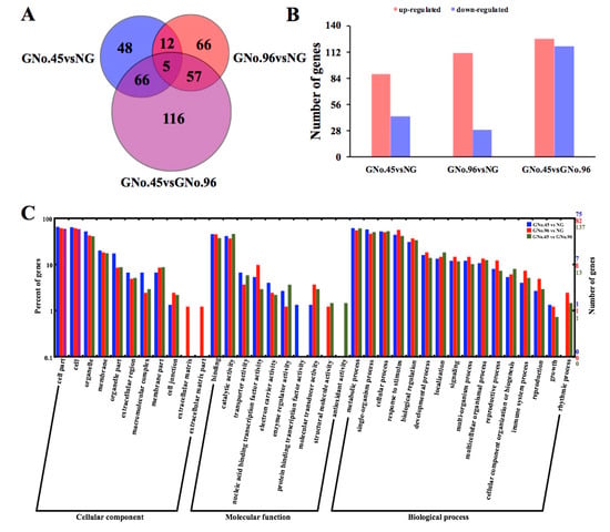 Number and gene ontology (GO) classification enrichment of differentially expressed genes (DEGs) among different comparisons of GNo.45 vs. NG, GNo.96 vs. NG, and GNo.45 vs. GNo.96. (A) Venn-diagram of significantly different DEGs. (B) Number of up- and down-regulated DEGs. (C) GO classification significant enrichment was analyzed by pairwise comparisions of GNo.45 vs. NG, GNo.96 vs. NG, and GNo.45 vs. GNo.96. (p < 0.05). The DEGs were assigned into three classifications of the cellular components, molecular function, and biological process.