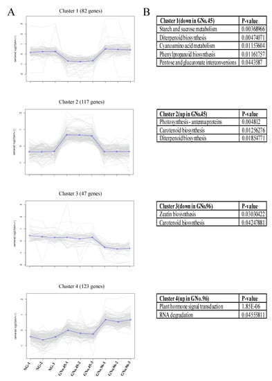 The significant DEGs were clustered into four clusters by K-means clustering, based on the Pearson correlation distances (Figure 5). Each cluster represented the gene expression of each sample. Cluster 1 contained the genes that were particularly downregulated in the heterograft GNo.45 in comparison to the non-grafted control and heterograft GNo.96. The functional categories were associated with starch and sucrose metabolism (Csa1G611290; Csa3G402970; Csa5G568300; Csa7G343850), diterpenoid biosynthesis (Csa3G903550; Csa3G904060), cyanoamino acid metabolism (Csa1G611290; Csa3G402970), phenylpropanoid biosynthesis (Csa1G611290; Csa3G402970; Csa4G038620), and pentose and glucuronate interconversions (Csa5G568300; Csa7G343850). Cluster 2 contained genes that were particularly upregulated in the heterograft GNo.45 in comparison to the self-grafted control and heterograft GNo.96. The functional category of the photosynthesis-antenna proteins, carotenoid biosynthesis, and diterpenoid biosynthesis were enriched in this cluster, along with the GO term catalytic activity. The genes related to zeatin biosynthesis and carotenoid biosynthesis exhibited a higher expression in the heterograft GNo.96 cucumber fruit than in the heterograft GNo.45 and non-grafted cucumber (Cluster 3). The genes involved in plant hormone signal transduction and RNA degradation were expressed at significantly lower levels in the heterograft GNo.96 cucumber fruit than the heterograft GNo.45 and non-grafted cucumber (Cluster 4).