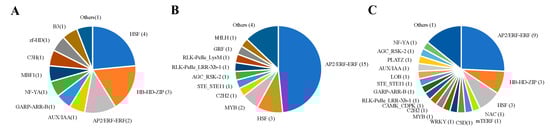 Classification of differently expressed TFs in comparisons of (A) GNo.45 vs. NG, (B) GNo.96 vs. NG, and (C) GNo.45 vs. GNo.96.