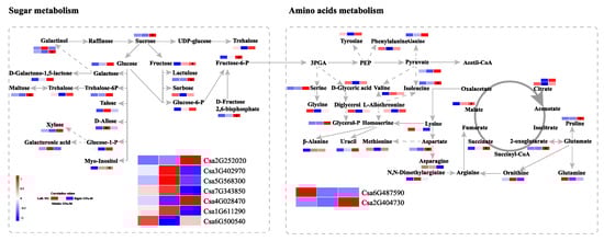 We investigated the changes in the cucumber fruits from the plants grafted on two rootstocks, with significant differences in physiological profiling, as reflected by metabolic and transcriptome analysis. We focused our attention on the primary carbon metabolism, including glycolysis and the TCA cycle, based on the metabolic-gene correlation analysis results (Figure 7). Glycolysis and the TCA cycle not only provide an energy and carbon source for plant growth and development, their derivatives also affect the quality of fruit, such as sweetness and aroma profile []. In total, seven DMs related to the glycolysis metabolism were notably increased in GNo.45 compared with the non-grafted cucumber, including sucrose and fructose. Fructose is one of the major free sugars in cucumber fruit [], and is regarded as the sweetest sugar. The expression of fructose-bisphosphate aldolase (Csa2G252020) was also significantly higher in GNo.45 than in the self-grafted plants. Six related DEGs exhibit different expression patterns in cucumber grafted onto different rootstocks, including two beta-glucosidases (Csa3G402970 and Csa1G611290), two pectin esterases (Csa5G568300 and Csa7G343850), and two trehalose-6-phosphate phosphatases (Csa4G028470 and Csa6G500540). In plants, the glycoside hydrolase (GH) family 1 beta -glycosidases are thought to be critically involved in many diverse processes, including chemical defense against herbivory, lignification, hydrolysis of cell wall-derived oligosaccharides during germination, and control of the active phytohormone levels []. Pectin esterases (PE) catalyze the demethylation of pectin, and the total PE activity decreased at the ending of the fruit ripening process in many plants, such as melon [], peach [], and strawberry []. Fruit-specific PE isoform affects tissue integrity during senescence in tomato []. Trehalose-6-phosphate phosphatase (TPP) is a critical enzyme for the synthesis of Trehalose-6-phosphate phosphatase, which regulates sugar influx into glycolysis []. Putative shikimate kinase (Csa6G487590) and LL-diaminopimelate aminotransferase (Csa2G404730) are involved in the biosynthesis of amino acids. Additionally, lipoxygenase (Csa2G023880) is possibly responsible for linoleic acid metabolism. The lipoxygenase (LOX) pathway induces unsaturated fatty acids to undergo stereospecific oxygenation to form 9-hydroperoxy and 13-hydroperoxy intermediates, finally yielding volatile compounds []. The expression patterns of these candidate genes were verified with quantitative RT-PCR (Figure S2), except for Csa7G343850 and Csa6G487590. These candidate genes should be helpful to improve grafted cucumber fruit quality, but functional studies in candidate genes are still required in order to clarify the differences induced by the rootstock.