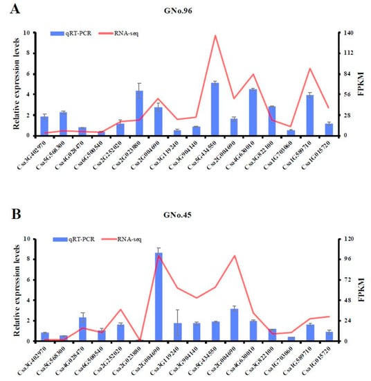 Relative expression levels of 16 genes in cucumber fruits from (A) GNo.45 and (B) GNo.96, as determined by qRT-PCR and fragments per kilobase of transcript per million (FPKM) mapped reads methods.