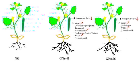 Grafting is used in cucumber cultivation, because the well-developed root of the rootstock is often resistant or tolerant to biotic or abiotic stress [,]. Nonetheless, the use of grafting can result in deterioration in the flavor quality of grafted cucumbers, decreasing consumer value. In this study, we used a combined metabolome and transcriptome approach to effectively explore the candidate metabolites, pathways, and genes affecting grafted cucumber flavors (Figure 9).