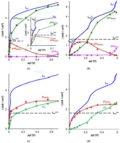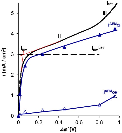 - Belashova, E.D.; Pismenskaya, N.D.; Nikonenko, V.V.; Sistat, P.; Pourcelly, G. Current-voltage characteristic of anion-exchange membrane in monosodium phosphate solution. Modelling and experiment. J. Membr. Sci. 2017, 542, 177–185. [Google Scholar] [CrossRef]
