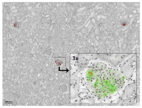 Glomerular PKH and Qtracker-625 fluorescence in cortical tissue after NMP with 107 MSCs added. Both fluorescent channels combined (red) in overview, showing that most glomeruli were negative and only a minority of glomeruli were positive for infused pre-labelled MSCs. In addition, some positive glomeruli contained more than one MSC. Inset shows a 3x magnified confocal fluorescence microscopy image with emission wavelengths of both dyes separated: PKH = green, Qtracker-625 = orange.