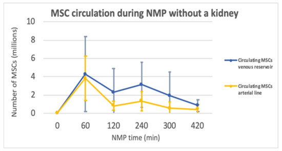 Graph of the MSCs circulating during NMP in the venous reservoir and the arterial line after the addition of 10 million MSCs at t = 60.