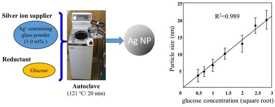 - Mori, Y.; Tagawa, T.; Fujita, M.; Kuno, T.; Suzuki, S.; Matsui, T.; Ishihara, M. Simple and environmentally friendly preparation and size control of silver nanoparticles using an inhomogeneous system with silver-containing glass powder. J. Nanopart. Res. 2011, 13, 2799–2806. [Google Scholar] [CrossRef]